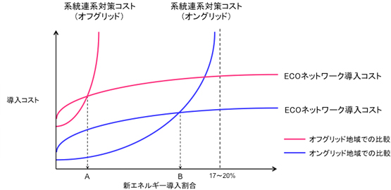 既存電力系統への新エネルギー導入コストは、その導入量が一定以上になればECO ネットワークに優位性があります。また、電力系統に新エネルギーを導入できる割合は、一般に17〜20%が限界とされていますが、ECOネットワークでは新エネルギーの導入割合に制限はありません。